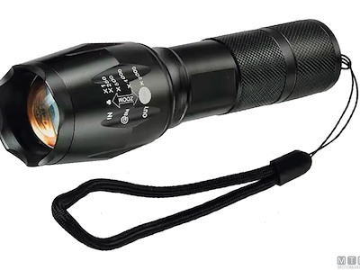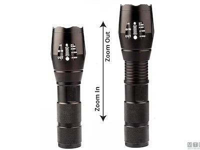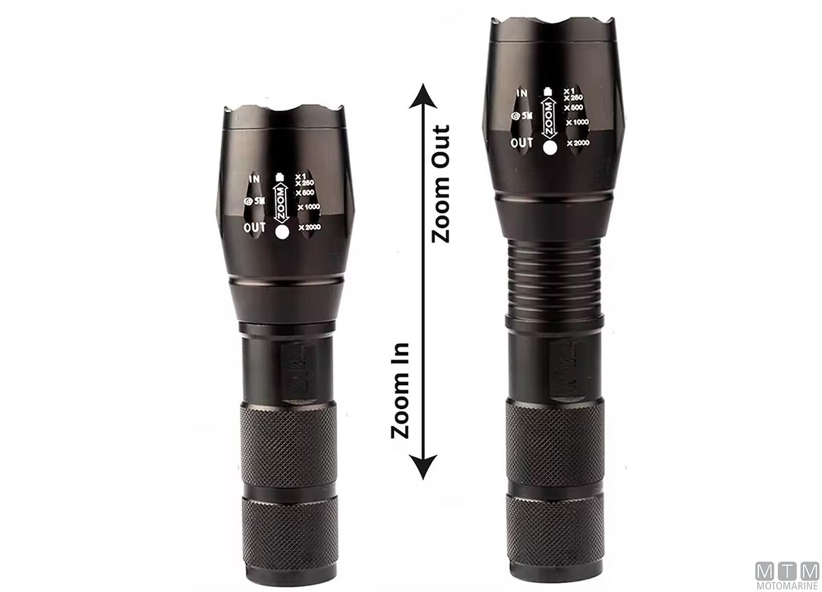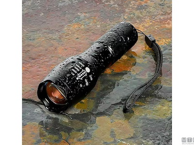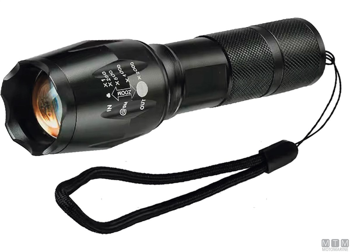 Torcia LED compatta impermeabile IP65 da 300 Lumen con corpo in Alluminio zigrinato.4 tipi di luce settabili: forte (100%) - media (50%) - bassa (20%) - lampeggiante.Zoom per poter variare la concentrazione del fascio luminoso.Funziona con 3 batterie tipo AAA, oppure con una batteria ricaricabile 18650 (non incluse).