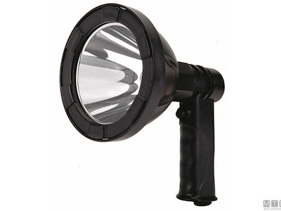 Torcia LED ricaricabile leggera e molto potente con batteria al Litio e oltre 2 ore di autonomia. Completa di caricabatterie 220V e spina 12V tipo accendino con cavo.