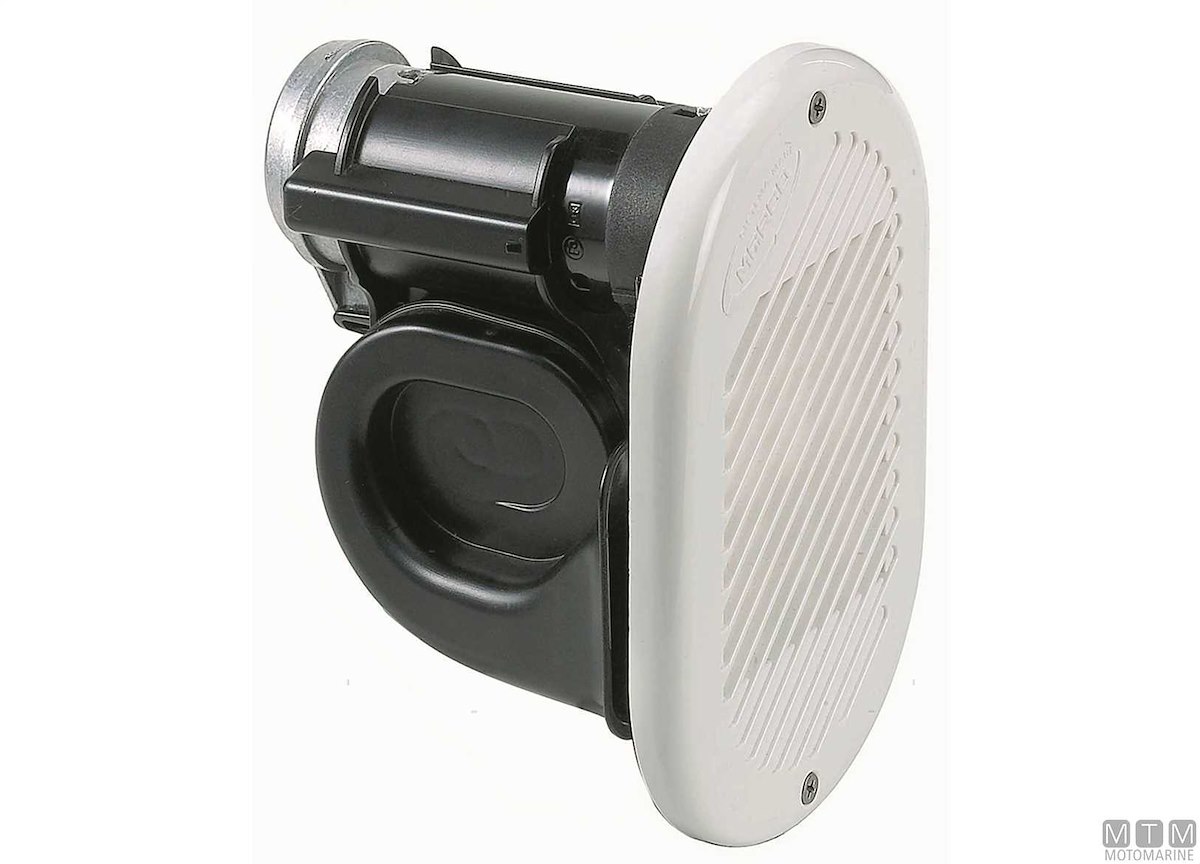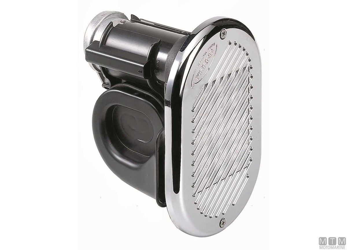 Tromba elettropneumatica ad incasso con corpo in Tecnopolimero. Compressore incorporato di eccezionale potenza sonora con suono grave, tipicamente nautico.