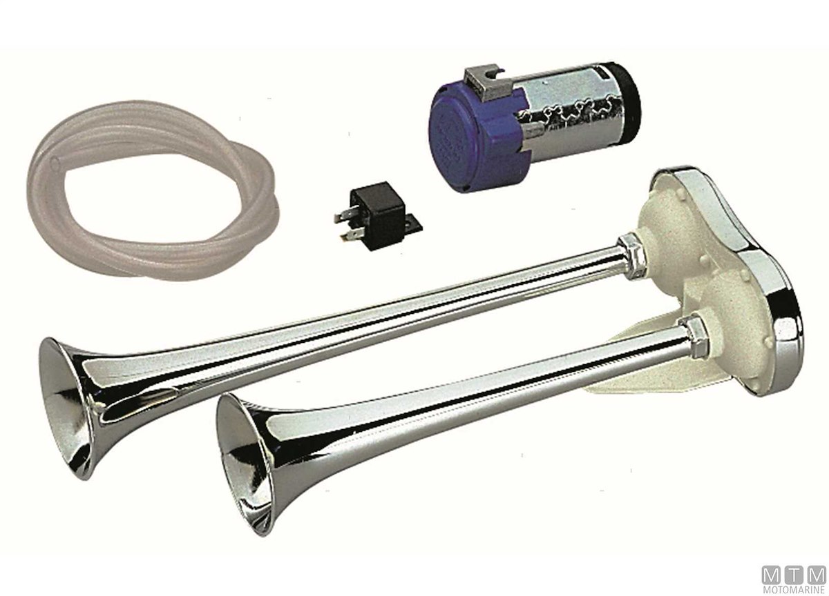 Tromba elettropneumatica doppia con corpo in Ottone Cromato e composito. Cornetti in Tecnopolimero Cromato. Completa di compressore, tubazioni e attacchi.