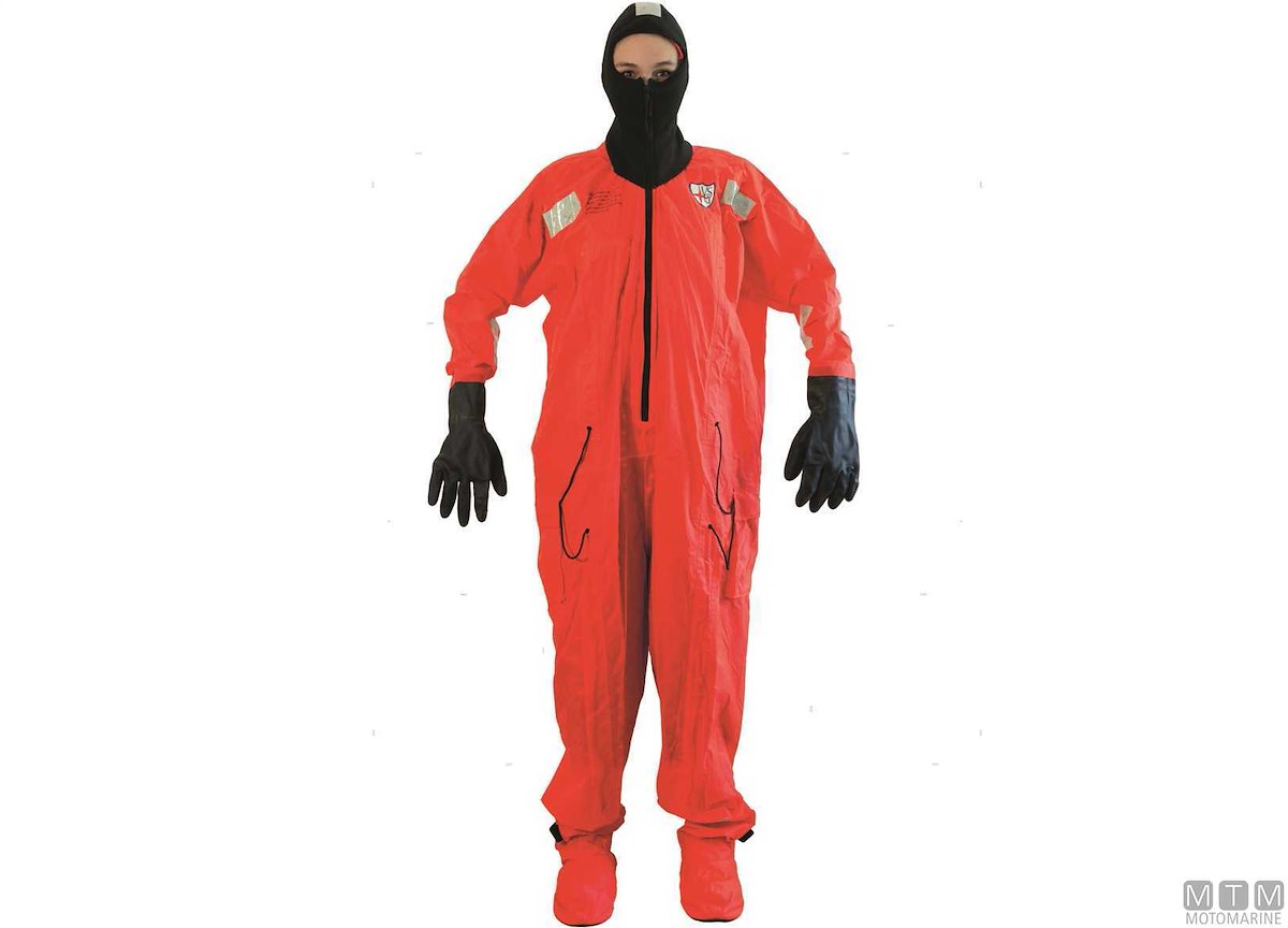 Tuta ad alta protezione termica approvata SOLAS MED in Poliestere Oxford/PU multistrato. Taglia unica con sistema di regolazione a corda, cerniera a tenuta stagna, cappuccio in Neoprene e calzari rinforzati.