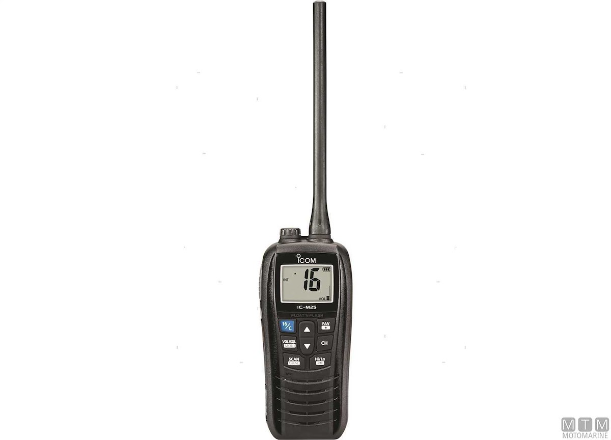 VHF portatile ICOM IC-M25E Evo impermeabile IPx7 galleggiante con suono di allarme e luce rossa di segnalazione LED. Impugnatura ergonomica con display LCD e tasti retroilluminati, microfono a cancellazione di rumore, funzioni dual/tri watch, autoscan e AquaQuake per rimuovere l'acqua dalla griglia. Tasto dedicato canale 16, 5W potenza RF e 11 ore di autonomia. Completo di batteria Li-Ion, caricabatterie, cavo micro USB, clip da cintura, antenna, cinghiello e manuale. Dimensioni: 57 x 31 x H134 mm.