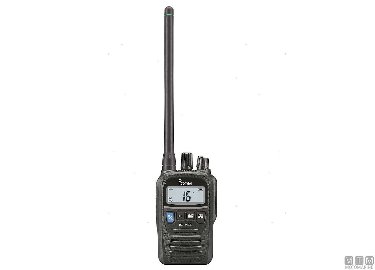 HF portatile ICOM IC-M85E ultracompatto e leggero, con 100 canali programmabili in banda PMR. Corpo impermeabile IP67 con display LCD e tasti retroilluminati. Include funzioni Dual/Tri Watch, TAG, MOB, Lone Worker, Vox (uso a mani libere) e AquaQuake per il drenaggio dell’acqua dall’altoparlante. Potenza di trasmissione 5W, autonomia fino a 14 ore. Completo di pacco batterie, caricabatterie da tavolo, antenna, clip da cintura, cinghiello e manuale.Dimensioni: 56 x 29 x H92 mm.