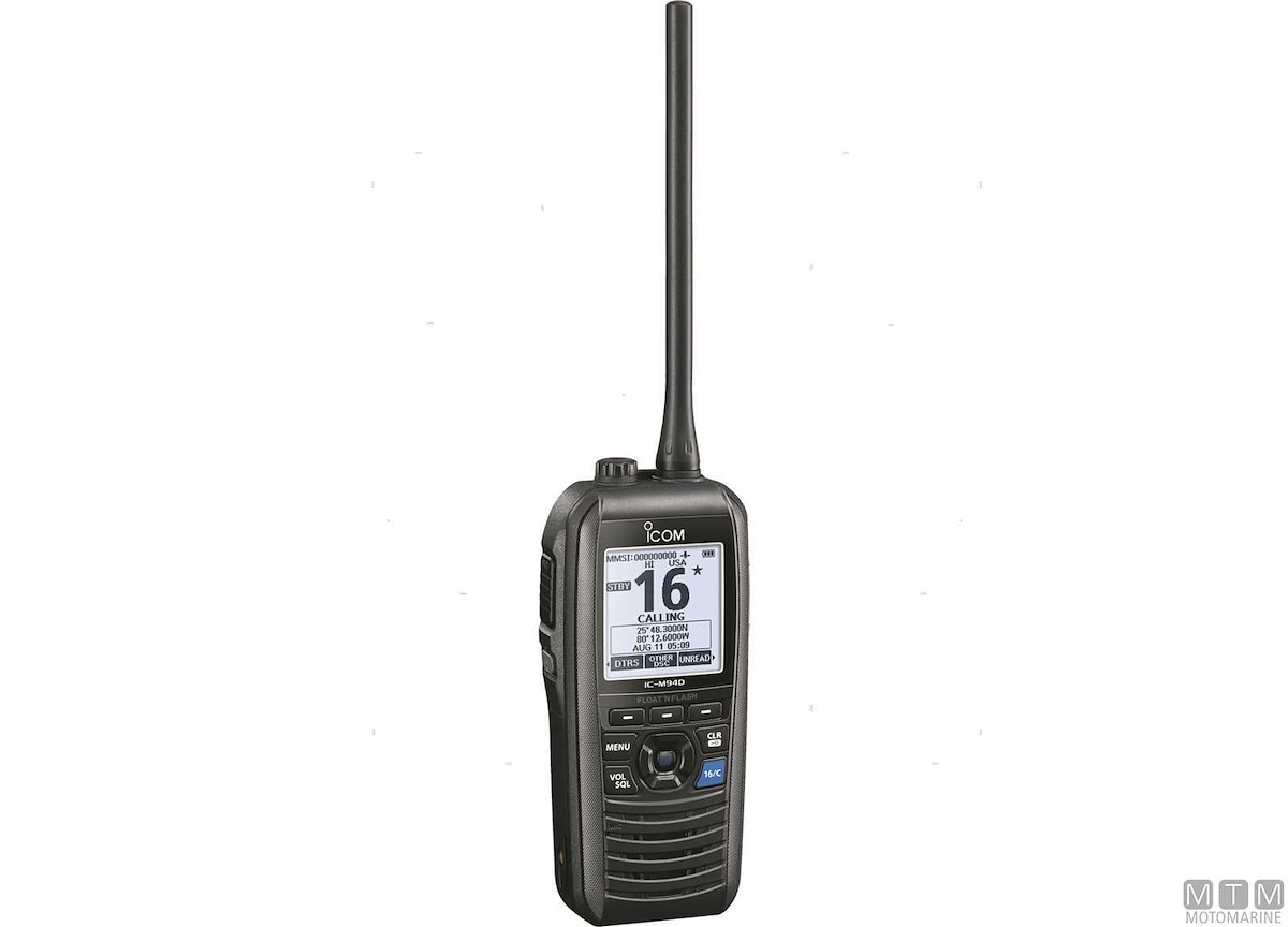 VHF portatile ICOM IC-M94DE con DSC classe H e ricevitori AIS e GPS integrati. Impugnatura snella ed ergonomica, con ampio display LCD e tasti retroilluminati. Impermeabile IPx7 e galleggiante con luce di allarme che si attiva in caso di caduta accidentale in acqua. Dotato di funzione AquaQuake per rimuovere l'acqua dalla griglia, ANC per la cancellazione del rumore, dual/tri watch, tasto MOB, tasto dedicato canale 16 e TAG. Potenza 6W con 10 ore di autonomia. Completo di pacco batterie, caricabatterie da tavolo, clip da cintura, antenna, cinghiello e manuale. Dimensioni: 61 x 44 x H146 mm.