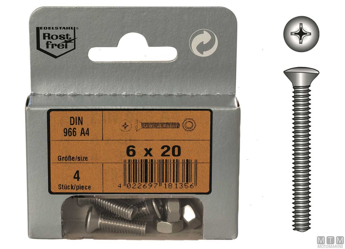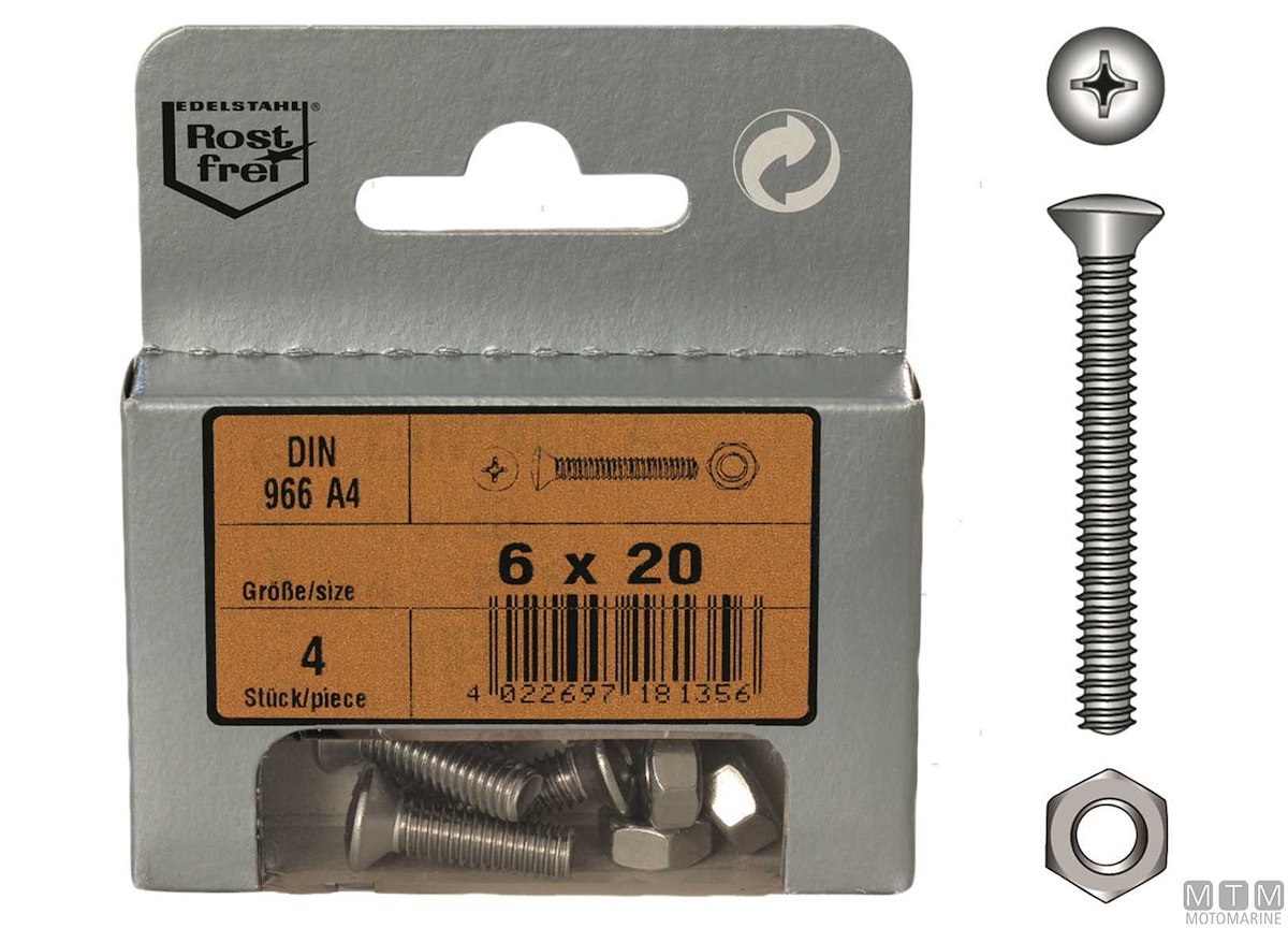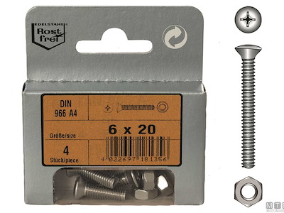 Viti testa svasata con calotta DIN 966 in Acciaio Inox A4. Confezione in Blister completa di dadi.